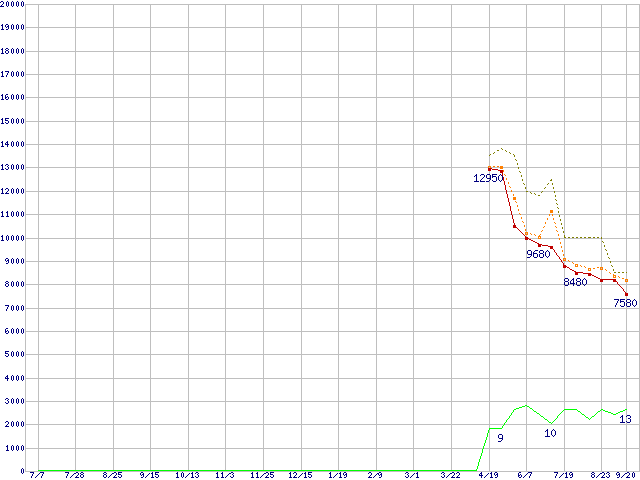 SSD 330 (120GB,MLC)の価格推移↑前グラフ↓次グラフ(2011年7月7日〜2012年9月20日)※このグラフは過去のデータも税率5%相当に調整した税込み相当額のグラフです。●関連グラフHDD/SSD主要製品の最安値推移HDD/SSD主要製品(最安値1万円未満)の最安値推移HDD 100〜160GB未満の最安値推移SSD 330 (SSD,6Gbps,2.5インチ,リード500MB/s・ライト450〜400MB/s)の最安値推移●凡例最安値(点線部は販売店未確認または未調査)平均値最高値ショップ数