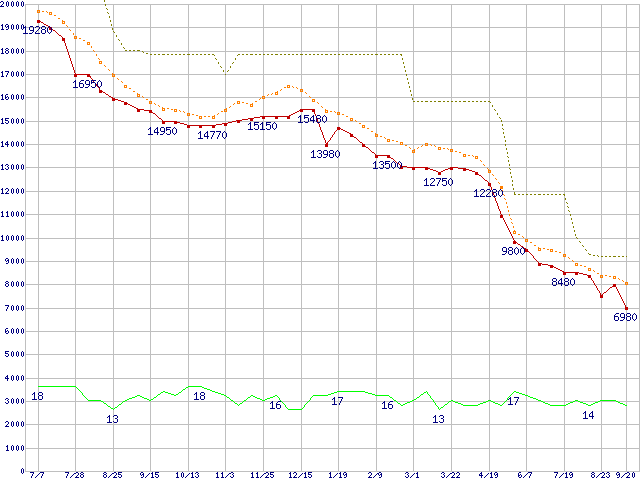 m4 (128GB,MLC)の価格推移↑前グラフ↓次グラフ(2011年7月7日〜2012年9月20日)※このグラフは過去のデータも税率5%相当に調整した税込み相当額のグラフです。●関連グラフHDD/SSD主要製品の最安値推移HDD/SSD主要製品(最安値1万円未満)の最安値推移HDD 100〜160GB未満の最安値推移m4 (SSD,6Gbps,2.5インチ,リード415MB/s・ライト260〜95MB/s)の最安値推移●凡例最安値(点線部は販売店未確認または未調査)平均値最高値ショップ数