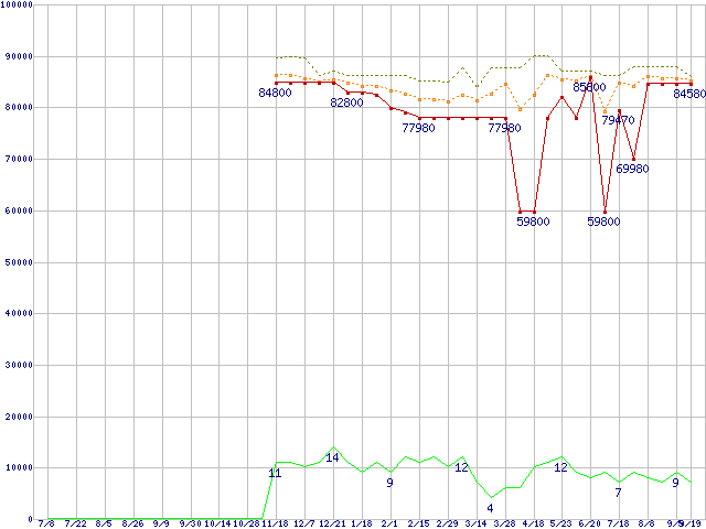 Core i7-3960X Extreme Edition (3.30GHz,15MB)の価格推移↑前グラフ↓次グラフ(2011年7月8日〜2012年9月19日)※このグラフは過去のデータも税率5%相当に調整した税込み相当額のグラフです。●関連グラフCPU主要製品の最安値推移CPU主要製品(最安値6万円以上)の最安値推移Intel系CPUの最安値推移LGA2011 (Hyper-Threading,TDP 130W)の最安値推移●凡例最安値(点線部は販売店未確認または未調査)平均値最高値ショップ数