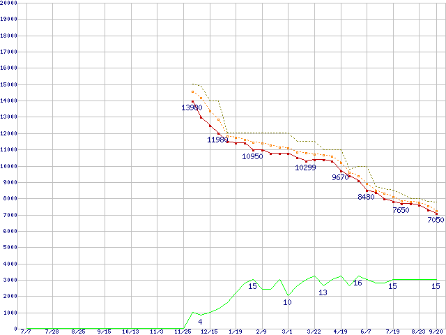 ST2000DM001 (2TB,64MB)の価格推移↑前グラフ↓次グラフ(2011年7月7日〜2012年9月20日)※このグラフは過去のデータも税率5%相当に調整した税込み相当額のグラフです。●関連グラフHDD/SSD主要製品の最安値推移HDD/SSD主要製品(最安値1万円未満)の最安値推移HDD 2TB〜2.5TB未満の最安値推移Barracuda (7200rpm,6Gbps)の最安値推移●凡例最安値(点線部は販売店未確認または未調査)平均値最高値ショップ数