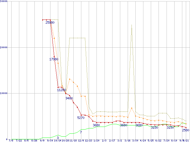 PC3-10600 8GBの価格推移↓次グラフ(2011年7月8日〜2012年9月21日)※このグラフは過去のデータも税率5%相当に調整した税込み相当額のグラフです。●関連グラフメモリ主要製品の最安値推移メモリ主要製品(最安値5千円未満)の最安値推移PC3-10600(DDR3-1333) DDR3 SDRAM DIMMの最安値推移●凡例最安値(点線部は販売店未確認または未調査)平均値最高値ショップ数