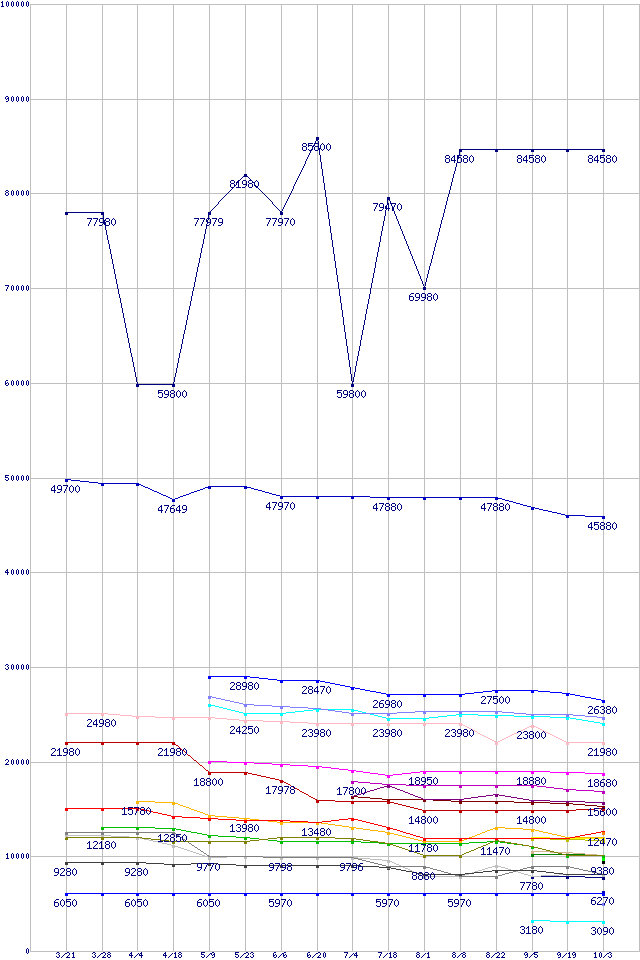 CPU主要製品の最安値推移↑前グラフ(2012年3月21日〜2012年10月3日)※このグラフは過去のデータも税率5%相当に調整した税込み相当額のグラフです。凡例Core i7-3960X Extreme Edition (3.30GHz,15MB)Core i7-3930K (3.20GHz,12MB)Core i7-3770K (3.50GHz,HD 4000,TDP 77W)Core i7-3770S (3.10GHz,HD 4000,TDP 65W)Core i7-3770 (3.40GHz,HD 4000,TDP 77W)Core i7-3820 (3.60GHz,10MB)Core i5-3570K (3.40GHz,HD 4000,TDP 77W)Core i5-3570 (3.40GHz,TDP 77W)Core i5-3470S (2.90GHz,TDP 65W)Core i5-3470 (3.20GHz,TDP 77W)FX-8150 (3.6GHz,L2 8MB,L3 8MB,TDP 125W)FX-8120 (3.1GHz,L2 8MB,L3 8MB,TDP 125W)A10-5800K (3.8GHz,TDP 100W)FX-6200 (3.8GHz,L2 6MB,L3 8MB,TDP 125W)A10-5700 (3.4GHz,TDP 65W)Core i3-3240 (3.4GHz,TDP 55W)Core i3-3225 (3.3GHz,HD 4000,TDP 55W)FX-6100 (3.3GHz,L2 6MB,L3 8MB,TDP 95W)Core i3-3220T (2.8GHz,TDP 35W)Core i3-3220 (3.3GHz,TDP 55W)FX-4170 (4.2GHz,L2 4MB,L3 8MB,TDP 125W)A8-5600K (3.6GHz,TDP 100W)A8-5500 (3.2GHz,TDP 65W)FX-4100 (3.6GHz,L2 4MB,L3 8MB,TDP 95W)A8-3820 (2.5GHz,TDP 65W)A8-3870K (3.0GHz,TDP 100W)Pentium G2120 (3.1GHz,TDP 55W)A6-5400K (3.6GHz,TDP 65W)Pentium G630T (2.3GHz,TDP 35W)A4-5300 (3.4GHz,TDP 65W)Celeron G465 (1.9GHz,1.5MB,TDP 35W)※製品名をクリックすると個別のグラフを表示します※点線部は販売店が確認できなかった、または調査データがないことを示します