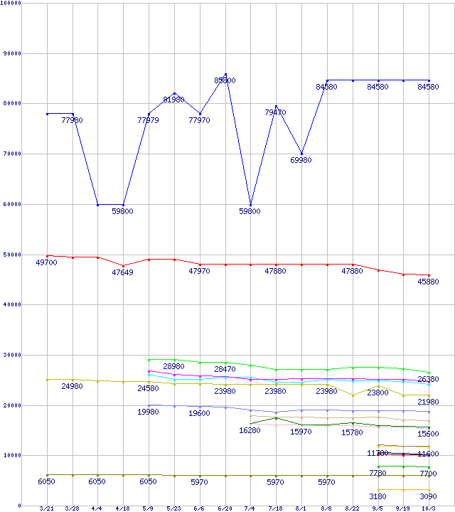 Intel系CPUの最安値推移↑前グラフ↓次グラフ(2012年3月21日〜2012年10月3日)※このグラフは過去のデータも税率5%相当に調整した税込み相当額のグラフです。凡例Core i7-3960X Extreme Edition (3.30GHz,15MB)Core i7-3930K (3.20GHz,12MB)Core i7-3770K (3.50GHz,HD 4000,TDP 77W)Core i7-3770S (3.10GHz,HD 4000,TDP 65W)Core i7-3770 (3.40GHz,HD 4000,TDP 77W)Core i7-3820 (3.60GHz,10MB)Core i5-3570K (3.40GHz,HD 4000,TDP 77W)Core i5-3570 (3.40GHz,TDP 77W)Core i5-3470S (2.90GHz,TDP 65W)Core i5-3470 (3.20GHz,TDP 77W)Core i3-3240 (3.4GHz,TDP 55W)Core i3-3225 (3.3GHz,HD 4000,TDP 55W)Core i3-3220T (2.8GHz,TDP 35W)Core i3-3220 (3.3GHz,TDP 55W)Pentium G2120 (3.1GHz,TDP 55W)Pentium G630T (2.3GHz,TDP 35W)Celeron G465 (1.9GHz,1.5MB,TDP 35W)※製品名をクリックすると個別のグラフを表示します※点線部は販売店が確認できなかった、または調査データがないことを示します