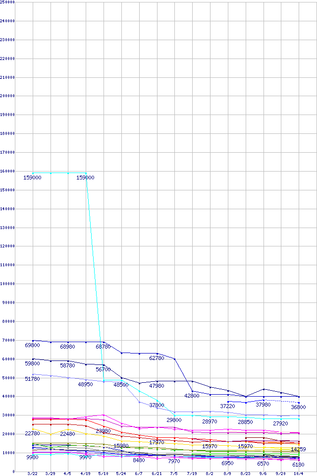 HDD/SSD主要製品の最安値推移↑前グラフ↓次グラフ(2012年3月22日〜2012年10月4日)※このグラフは過去のデータも税率5%相当に調整した税込み相当額のグラフです。凡例MZ-7PC512 (512GB,MLC)SSD 520 (480GB,MLC)PX-512M5P (512GB,MLC)m4 (512GB,MLC)その他6Gbps対応SSD (480〜512GB,MLC)PX-256M5P (256GB,MLC)0S03357(純正パッケージ品) (4TB,64MB)SSD 520 (240GB,MLC)PX-256M5S (256GB,MLC)WD20NPVT (2TB,8MB,15mm厚)m4 (256GB,MLC)MZ-7PC256 (256GB,MLC)WD30EFRX (3TB,64MB)SSD 330 (240GB,MLC)その他6Gbps対応SSD (240〜256GB,MLC)DT01ACA300 (3TB,64MB)PX-128M5P (128GB,MLC)SSD 520 (120GB,MLC)ST3000DM001 (3TB,64MB)WD20EFRX (2TB,64MB)WD30EZRX (3TB,64MB)PX-128M5S (128GB,MLC)DT01ACA200 (2TB,64MB)0S03224(純正パッケージ品) (2TB,32MB)m4 (128GB,MLC)SSD 330 (120GB,MLC)WD20EZRX (2TB,64MB)MZ-7PC128 (128GB,MLC)0S03509 (1TB,8MB)ST2000DM001 (2TB,64MB)WD20EARX (2TB,64MB)WD10JPVT (1TB,8MB)その他6Gbps対応SSD (120〜128GB,MLC)MQ01ABD100 (1TB,8MB)※製品名をクリックすると個別のグラフを表示します※点線部は販売店が確認できなかった、または調査データがないことを示します