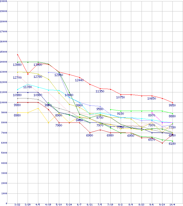 HDD/SSD主要製品(最安値1万円未満)の最安値推移↑前グラフ↓次グラフ(2012年3月22日〜2012年10月4日)※このグラフは過去のデータも税率5%相当に調整した税込み相当額のグラフです。凡例WD20EFRX (2TB,64MB)WD30EZRX (3TB,64MB)PX-128M5S (128GB,MLC)DT01ACA200 (2TB,64MB)0S03224(純正パッケージ品) (2TB,32MB)m4 (128GB,MLC)SSD 330 (120GB,MLC)WD20EZRX (2TB,64MB)MZ-7PC128 (128GB,MLC)0S03509 (1TB,8MB)ST2000DM001 (2TB,64MB)WD20EARX (2TB,64MB)WD10JPVT (1TB,8MB)その他6Gbps対応SSD (120〜128GB,MLC)MQ01ABD100 (1TB,8MB)※製品名をクリックすると個別のグラフを表示します※点線部は販売店が確認できなかった、または調査データがないことを示します