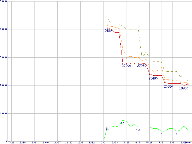 SSD 520 (240GB,MLC)の価格推移↑前グラフ↓次グラフ(2011年7月21日〜2012年10月4日)※このグラフは過去のデータも税率5%相当に調整した税込み相当額のグラフです。●関連グラフHDD/SSD主要製品の最安値推移HDD/SSD主要製品(最安値2万円以上)の最安値推移HDD 200〜250GB未満の最安値推移SSD 520 (SSD,6Gbps,2.5インチ,リード550MB/s・ライト520〜475MB/s)の最安値推移●凡例最安値(点線部は販売店未確認または未調査)平均値最高値ショップ数