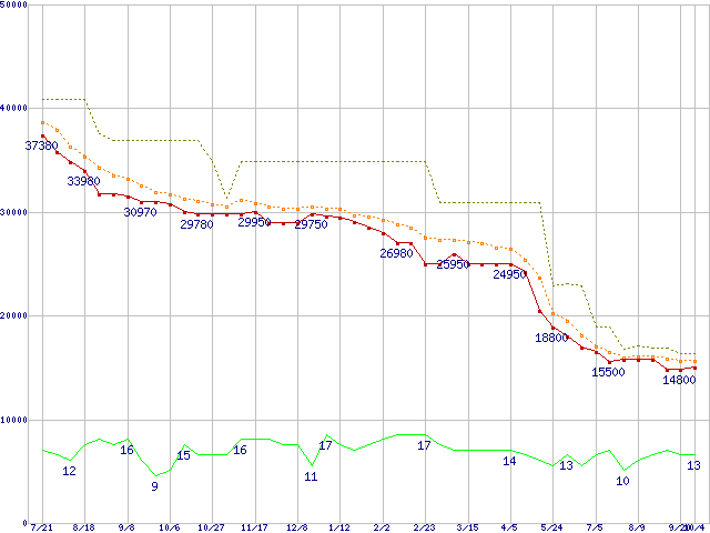 m4 (256GB,MLC)の価格推移↑前グラフ↓次グラフ(2011年7月21日〜2012年10月4日)※このグラフは過去のデータも税率5%相当に調整した税込み相当額のグラフです。●関連グラフHDD/SSD主要製品の最安値推移HDD/SSD主要製品(最安値1万5千円〜2万円未満)の最安値推移HDD 250〜300GB未満の最安値推移m4 (SSD,6Gbps,2.5インチ,リード415MB/s・ライト260〜95MB/s)の最安値推移●凡例最安値(点線部は販売店未確認または未調査)平均値最高値ショップ数