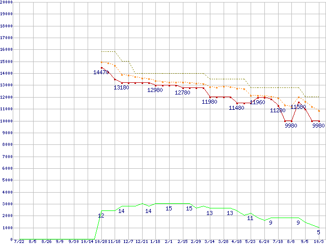 FX-6100 (3.3GHz,L2 6MB,L3 8MB,TDP 95W)の価格推移↑前グラフ↓次グラフ(2011年7月22日〜2012年10月3日)※このグラフは過去のデータも税率5%相当に調整した税込み相当額のグラフです。●関連グラフCPU主要製品の最安値推移CPU主要製品(最安値1万円未満)の最安値推移AMD系CPUの最安値推移Socket AM3+ (HyperTransport,6Core)の最安値推移●凡例最安値(点線部は販売店未確認または未調査)平均値最高値ショップ数