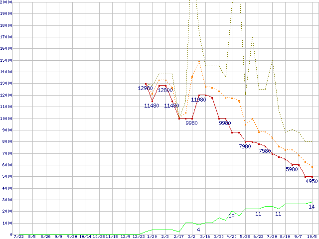 PC3-12800 8GB×2枚組セットの価格推移↓次グラフ(2011年7月22日〜2012年10月5日)※このグラフは過去のデータも税率5%相当に調整した税込み相当額のグラフです。●関連グラフメモリ主要製品の最安値推移メモリ主要製品(最安値5千円未満)の最安値推移PC3-12800(DDR3-1600) DDR3 SDRAM DIMMの最安値推移●凡例最安値(点線部は販売店未確認または未調査)平均値最高値ショップ数