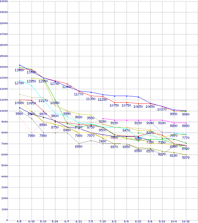 HDD/SSD主要製品(最安値1万円未満)の最安値推移↑前グラフ↓次グラフ(2012年4月5日〜2012年10月18日)※このグラフは過去のデータも税率5%相当に調整した税込み相当額のグラフです。凡例ST3000DM001 (3TB,64MB)WD30EZRX (3TB,64MB)WD20EFRX (2TB,64MB)PX-128M5S (128GB,MLC)m4 (128GB,MLC)SSD 330 (120GB,MLC)DT01ACA200 (2TB,64MB)0S03224(純正パッケージ品) (2TB,32MB)WD20EZRX (2TB,64MB)WD20EARX (2TB,64MB)その他6Gbps対応SSD (120〜128GB,MLC)WD10JPVT (1TB,8MB)ST2000DM001 (2TB,64MB)0S03509 (1TB,8MB)MZ-7PC128 (128GB,MLC)MQ01ABD100 (1TB,8MB)※製品名をクリックすると個別のグラフを表示します※点線部は販売店が確認できなかった、または調査データがないことを示します