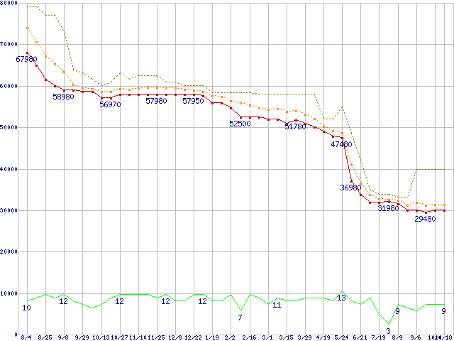 m4 (512GB,MLC)の価格推移↑前グラフ↓次グラフ(2011年8月4日〜2012年10月18日)※このグラフは過去のデータも税率5%相当に調整した税込み相当額のグラフです。●関連グラフHDD/SSD主要製品の最安値推移HDD/SSD主要製品(最安値2万円以上)の最安値推移HDD 500〜600GB未満の最安値推移m4 (SSD,6Gbps,2.5インチ,リード415MB/s・ライト260〜95MB/s)の最安値推移●凡例最安値(点線部は販売店未確認または未調査)平均値最高値ショップ数