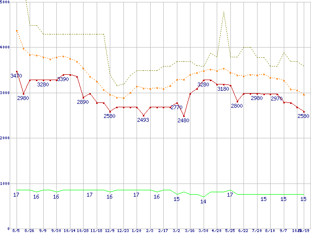 PC3-12800 4GB×2枚組みセットの価格推移↑前グラフ↓次グラフ(2011年8月5日〜2012年10月19日)※このグラフは過去のデータも税率5%相当に調整した税込み相当額のグラフです。●関連グラフメモリ主要製品の最安値推移メモリ主要製品(最安値5千円未満)の最安値推移PC3-12800(DDR3-1600) DDR3 SDRAM DIMMの最安値推移●凡例最安値(点線部は販売店未確認または未調査)平均値最高値ショップ数