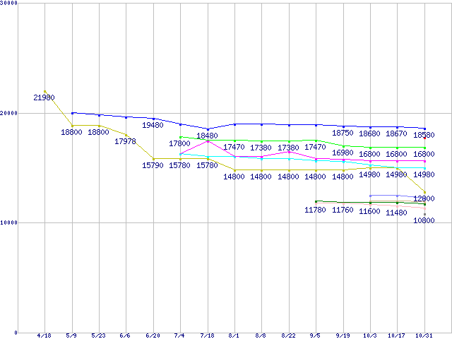 CPU主要製品(最安値1万円〜2万円未満)の最安値推移↑前グラフ↓次グラフ(2012年4月18日〜2012年10月31日)※このグラフは過去のデータも税率5%相当に調整した税込み相当額のグラフです。凡例Core i5-3570K (3.40GHz,HD 4000,TDP 77W)FX-8350 (4.0GHz,L2 8MB,L3 8MB,TDP 125W)Core i5-3570 (3.40GHz,TDP 77W)Core i5-3470S (2.90GHz,TDP 65W)Core i5-3470 (3.20GHz,TDP 77W)FX-8150 (3.6GHz,L2 8MB,L3 8MB,TDP 125W)A10-5800K (3.8GHz,TDP 100W)A10-5700 (3.4GHz,TDP 65W)Core i3-3240 (3.4GHz,TDP 55W)Core i3-3225 (3.3GHz,HD 4000,TDP 55W)FX-4300 (3.8GHz,L2 4MB,TDP 95W)※製品名をクリックすると個別のグラフを表示します※点線部は販売店が確認できなかった、または調査データがないことを示します