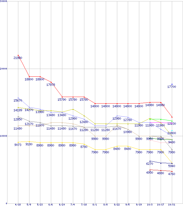 AMD系CPUの最安値推移↑前グラフ↓次グラフ(2012年4月18日〜2012年10月31日)※このグラフは過去のデータも税率5%相当に調整した税込み相当額のグラフです。凡例FX-8350 (4.0GHz,L2 8MB,L3 8MB,TDP 125W)FX-8150 (3.6GHz,L2 8MB,L3 8MB,TDP 125W)A10-5800K (3.8GHz,TDP 100W)A10-5700 (3.4GHz,TDP 65W)FX-4300 (3.8GHz,L2 4MB,TDP 95W)FX-8120 (3.1GHz,L2 8MB,L3 8MB,TDP 125W)FX-6200 (3.8GHz,L2 6MB,L3 8MB,TDP 125W)FX-6100 (3.3GHz,L2 6MB,L3 8MB,TDP 95W)A8-5600K (3.6GHz,TDP 100W)A8-5500 (3.2GHz,TDP 65W)FX-4170 (4.2GHz,L2 4MB,L3 8MB,TDP 125W)FX-4100 (3.6GHz,L2 4MB,L3 8MB,TDP 95W)A6-5400K (3.6GHz,TDP 65W)A4-5300 (3.4GHz,TDP 65W)※製品名をクリックすると個別のグラフを表示します※点線部は販売店が確認できなかった、または調査データがないことを示します