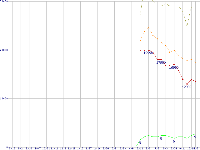 PC3-12800 8GB×4枚組セットの価格推移↑前グラフ↓次グラフ(2011年8月19日〜2012年11月2日)※このグラフは過去のデータも税率5%相当に調整した税込み相当額のグラフです。●関連グラフメモリ主要製品の最安値推移メモリ主要製品(最安値1万円以上)の最安値推移PC3-12800(DDR3-1600) DDR3 SDRAM DIMMの最安値推移●凡例最安値(点線部は販売店未確認または未調査)平均値最高値ショップ数
