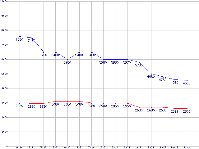 | ※製品名をクリックすると個別のグラフを表示します ※点線部は販売店が確認できなかった、または調査データがないことを示します |