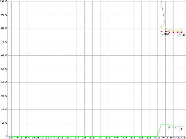 Pentium G2120 (3.1GHz,TDP 55W)の価格推移↑前グラフ↓次グラフ(2011年9月2日〜2012年11月14日)※このグラフは過去のデータも税率5%相当に調整した税込み相当額のグラフです。●関連グラフCPU主要製品の最安値推移CPU主要製品(最安値1万円未満)の最安値推移Intel系CPUの最安値推移LGA1155 (Smart Cache 3MB,Dual Core,GPU内蔵)の最安値推移●凡例最安値(点線部は販売店未確認または未調査)平均値最高値ショップ数