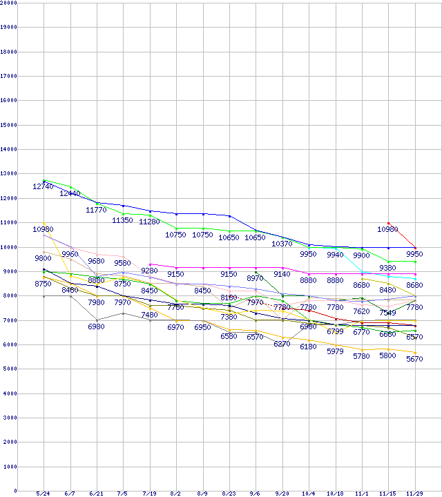 HDD/SSD主要製品(最安値1万円未満)の最安値推移↑前グラフ↓次グラフ(2012年5月24日〜2012年11月29日)※このグラフは過去のデータも税率5%相当に調整した税込み相当額のグラフです。凡例ST3000DM001 (3TB,64MB)MQ01ABC150 (1.5TB,8MB.12.5mm厚)WD30EZRX (3TB,64MB)PX-128M5S (128GB,MLC)WD20EFRX (2TB,64MB)SSD 840 (120GB,TLC)0S03224(純正パッケージ品) (2TB,32MB)m4 (128GB,MLC)DT01ACA200 (2TB,64MB)SSD 330 (120GB,MLC)その他6Gbps対応SSD (120〜128GB,MLC)MZ-7PC128 (128GB,MLC)ST2000DM001 (2TB,64MB)WD20EZRX (2TB,64MB)0S03509 (1TB,8MB)WD10JPVT (1TB,8MB)MQ01ABD100 (1TB,8MB)※製品名をクリックすると個別のグラフを表示します※点線部は販売店が確認できなかった、または調査データがないことを示します