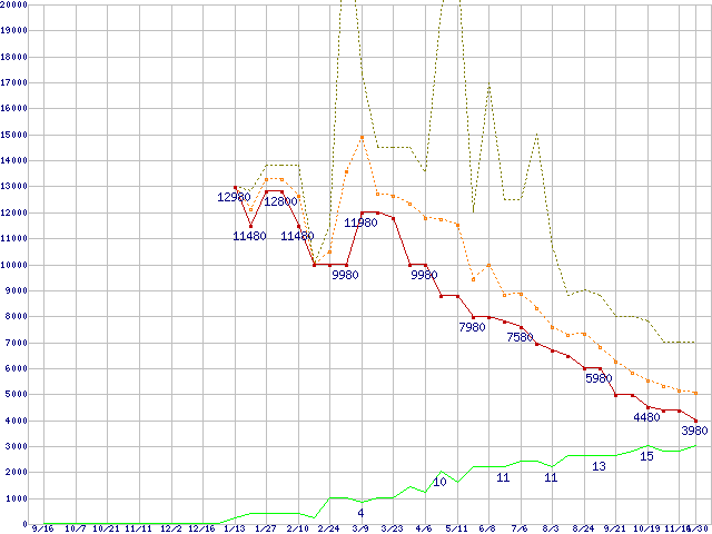 PC3-12800 8GB×2枚組セットの価格推移↓次グラフ(2011年9月16日〜2012年11月30日)※このグラフは過去のデータも税率5%相当に調整した税込み相当額のグラフです。●関連グラフメモリ主要製品の最安値推移メモリ主要製品(最安値5千円未満)の最安値推移PC3-12800(DDR3-1600) DDR3 SDRAM DIMMの最安値推移●凡例最安値(点線部は販売店未確認または未調査)平均値最高値ショップ数