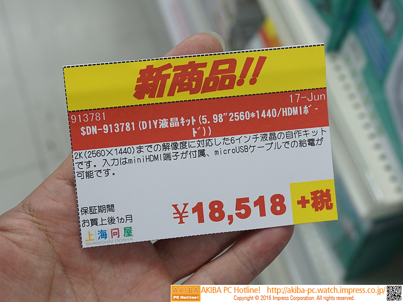 2,560×1,440ドットの6型液晶パネルキットが販売中、実売2万円