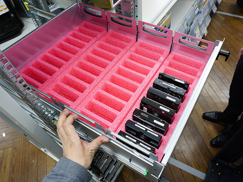 3.5インチHDDが40台収納できるラック用ドロワーが展示販売、ツクモ