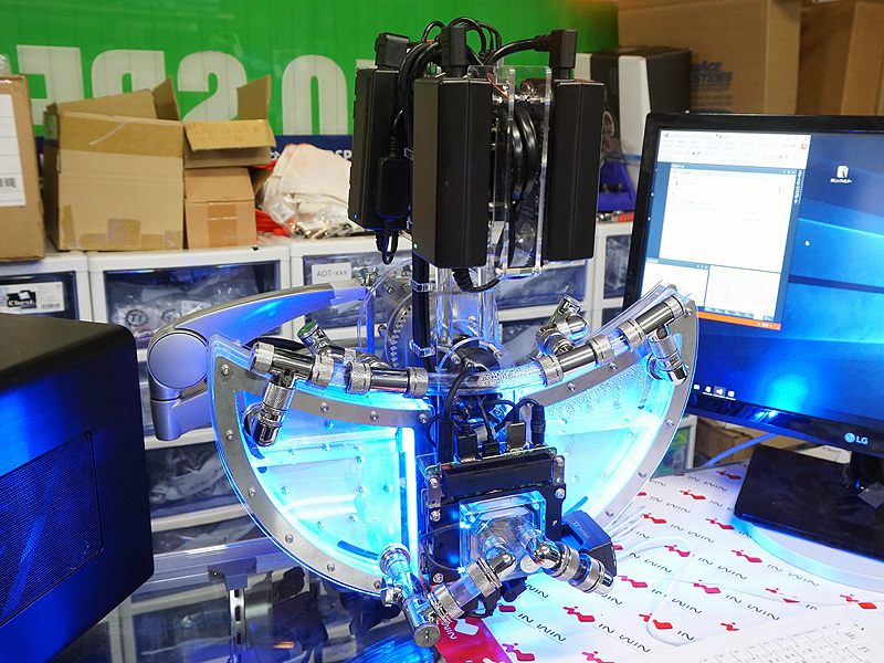 本体が振り子のように動く水冷PC「クレセントPC」が店頭展示中