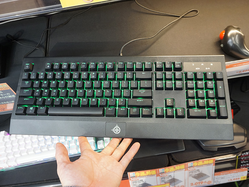 「どこかで見たような英語配列」のメカニカルキーボードが上海問屋から、黒色筐体に緑色のLED