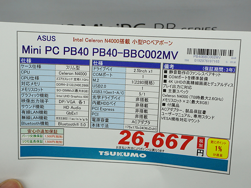 ASUSの薄型ファンレスPCキット「Mini PC PB40」が入荷、実売28,800円