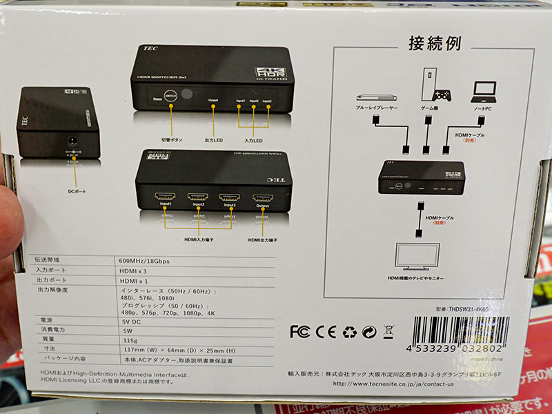 4K/60HzやHDRに対応したHDMI切替機がテックから、実売3,940円から
