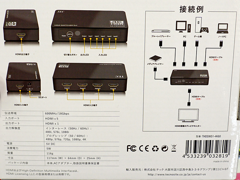 4K/60HzやHDRに対応したHDMI切替機がテックから、実売3,940円から