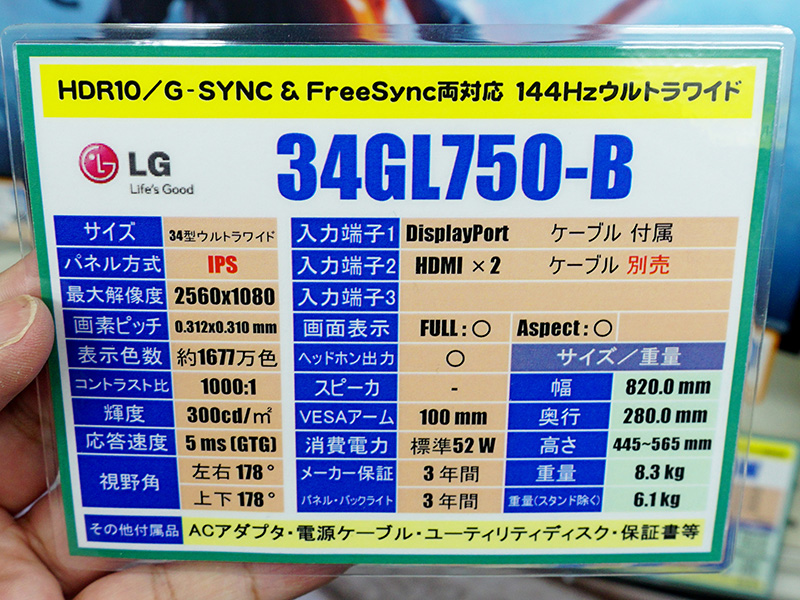 144Hz駆動の34型IPS液晶「34GL750-B」が発売、G-SYNC Compatible認定品