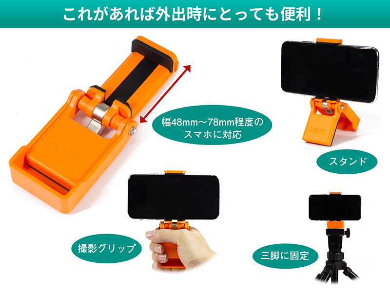 三脚に取り付けできるスマホ用スタンドが上海問屋から、折り畳み収納や手持ちも可能