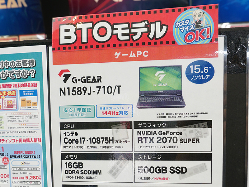144Hz液晶+GeForce RTX 2070 SUPER搭載ノート「G-GEAR note N1589J」が発売