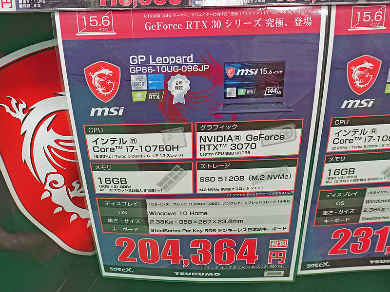 Core i7+RTX 3070搭載のMSI製15.6型ノート、液晶は144Hz駆動