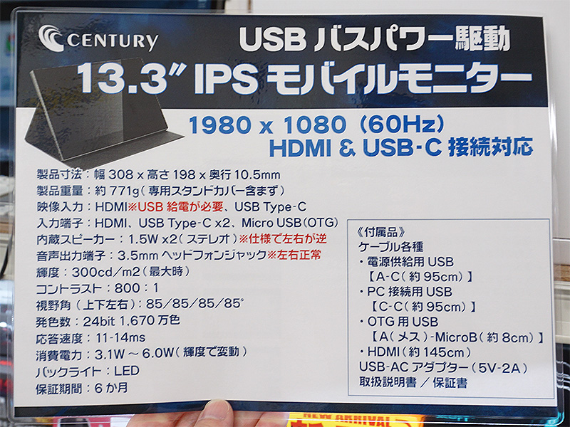 センチュリーの13.3型フルHDモバイル液晶が秋葉館に入荷、光沢仕様でスピーカー搭載