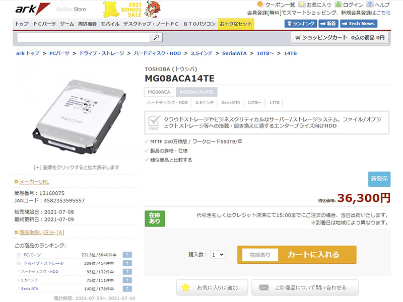 東芝の16TB HDD「MG08ACA16TE」が入荷、CMR方式でディスクは9枚