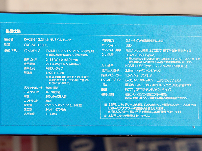センチュリー「RACEN」の13.3型モバイルモニターが入荷、USB Type-Cケーブル1本で動作