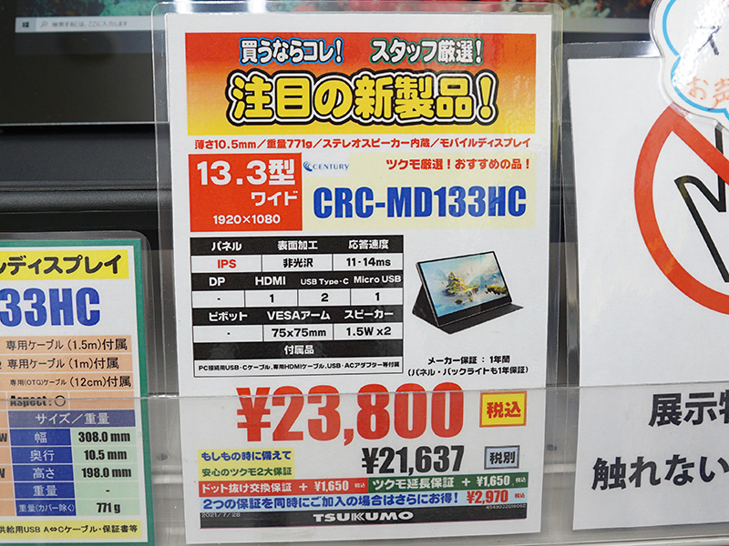 センチュリーの13.3型フルHDモバイル液晶が秋葉館に入荷、光沢仕様でスピーカー搭載