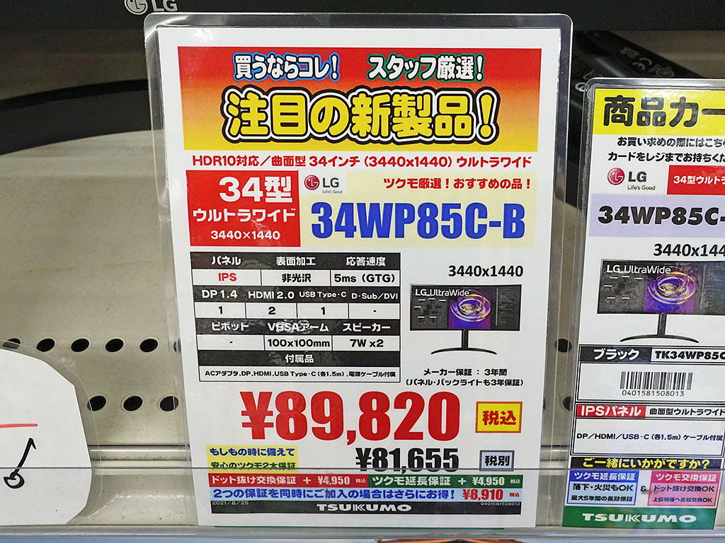 3,440×1,440ドットの34型曲面ディスプレイ「34WP85C-B」が入荷、アームスタンド採用モデルも有り