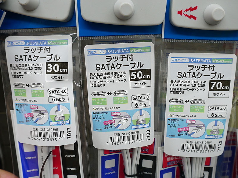 白いSATAケーブルがアイネックスから、ラッチ付きやL字など計8モデル
