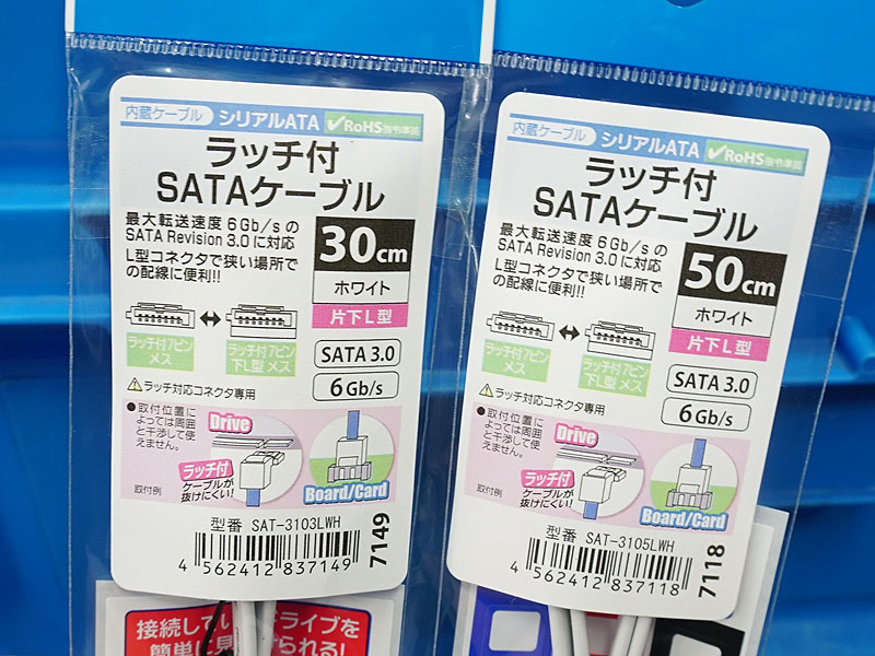 白いSATAケーブルがアイネックスから、ラッチ付きやL字など計8モデル