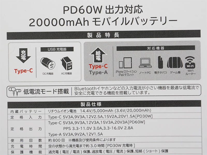PD 60W対応の20,000mAhモバイルバッテリーがオウルテックから、「低電流モード」も搭載
