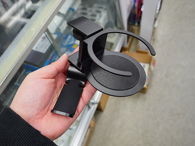 カップホルダーも備えたヘッドフォンハンガー、机の縁にクランプで固定