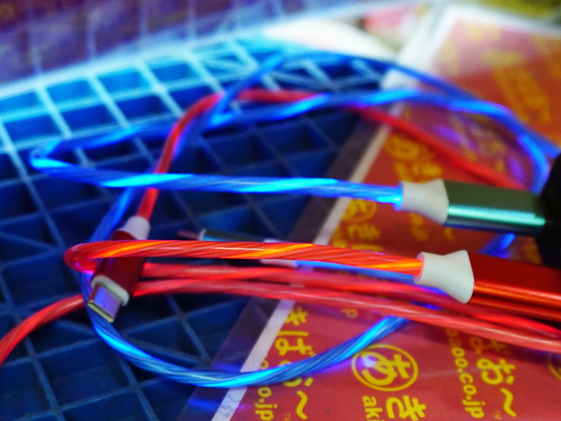 光るUSB Type-Cケーブルがあきばお~で330円、カラーは赤色と青色(3/4)
