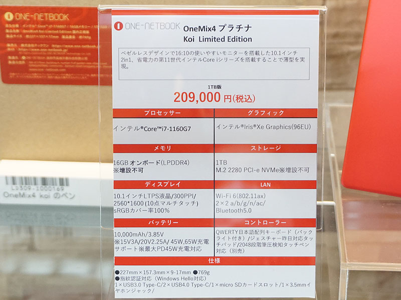 10.1インチ2in1「OneMix4」の“鯉モデル”が店頭入荷、赤色ボディの限定バージョン
