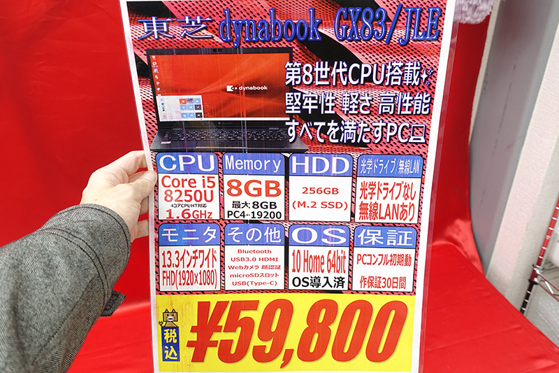 Core i5-8250U搭載の軽量13.3型ノート「dynabook GX83/JLE」が59,800円!PCコンフルで中古PCセール