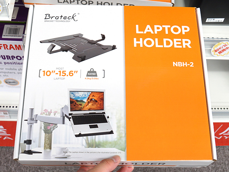 モニターアームに取り付けられるノートPCトレイが上海問屋から、縦置き用スタンドも