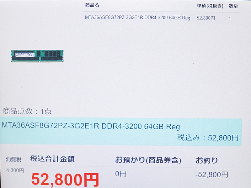 1枚で64GBのDDR4メモリが税込84,240円、ECC Registered対応