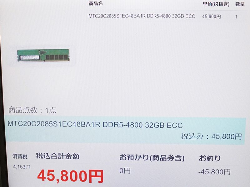 ECC付きDDR5-4800メモリがMicronから、32GB×1枚で45,800円