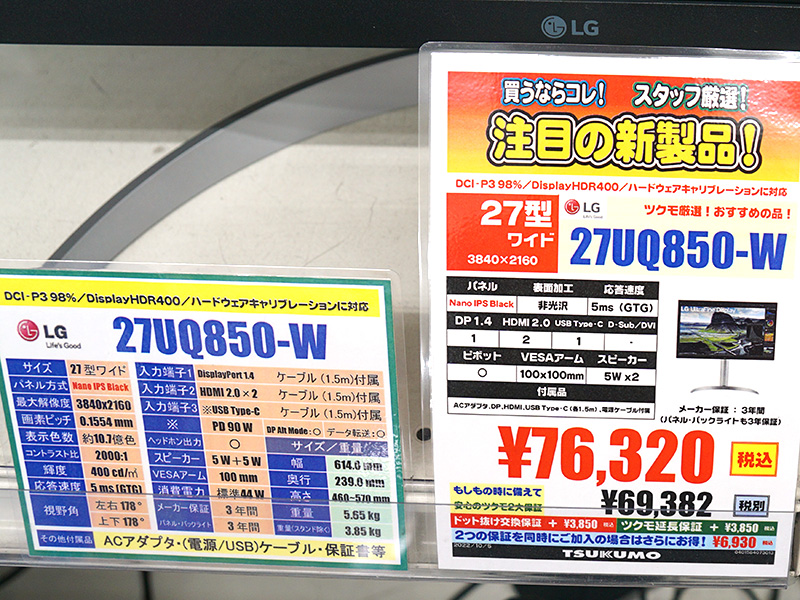 LGのクリエイター向け4K液晶「27UQ850-W」がTSUKUMOに入荷、実機展示中